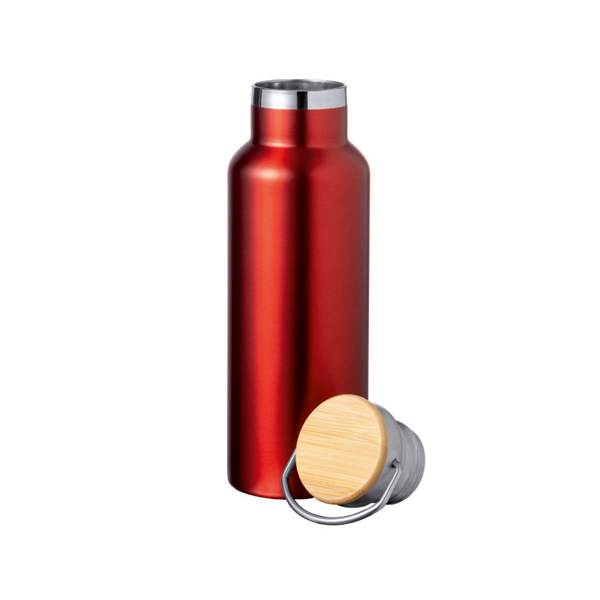 Termosflaska med dubbelvägg. Tillverkad i dubbelväggat rostfritt stål. Inklusive ett skruvlock i rostfritt stål med bambudetaljer och ett integrerat handtag.